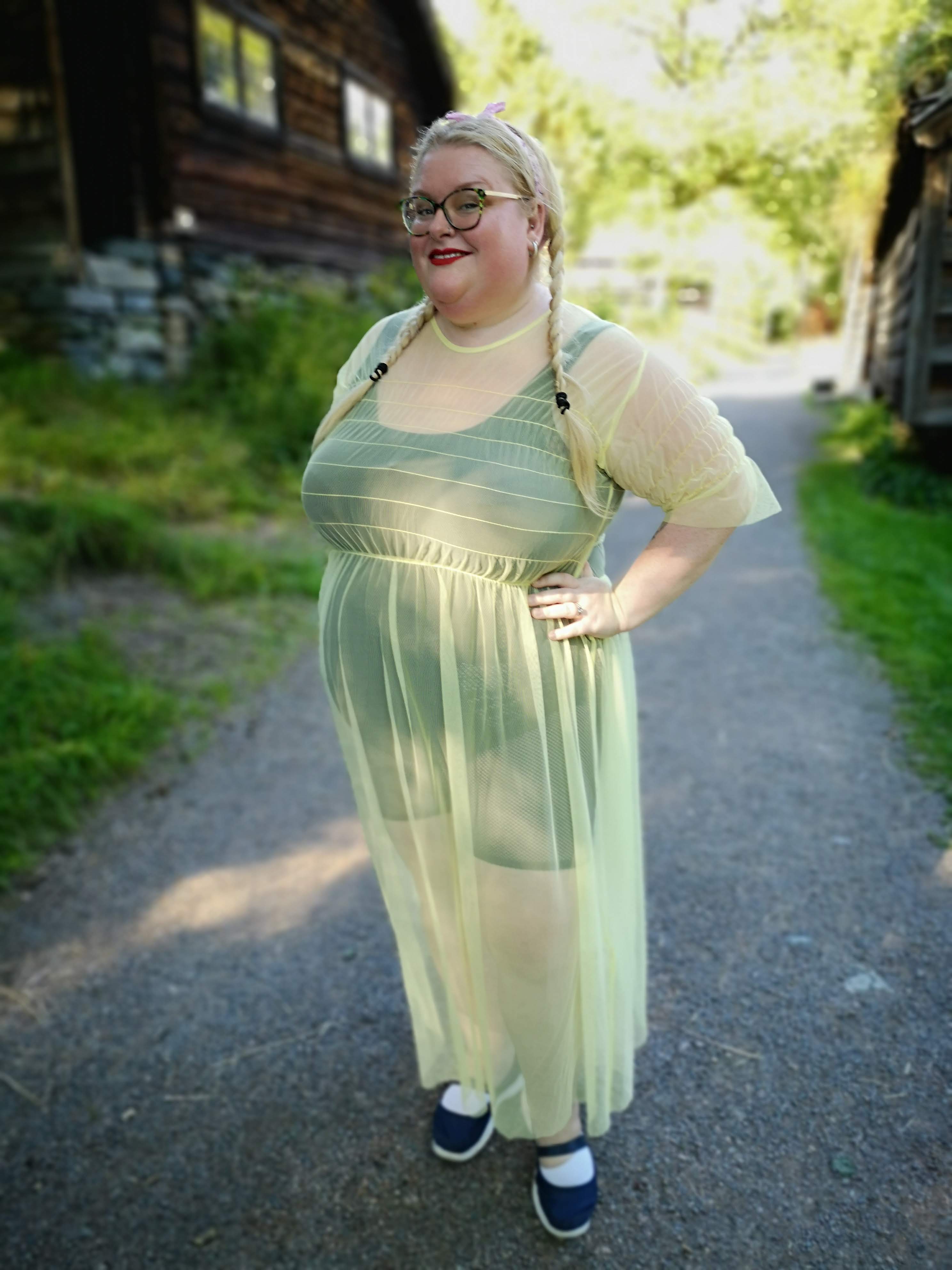 I paired the dress with a vest top from Primark and some fishnet cycling shorts from Boohoo and just my normal undies under for a see through effect. I was visiting a big museum in Oslo the day I was wearing this dress, but walking around in Oslo showing off my underwear felt rather liberating despite my age and I felt like a princess in this dress all day. Definitely out of my comfort zone, but would definitely do it again cause I loved this outfit. I might just wear my bra and panties under next time for even more of a wow factor. Great dress for a warm day and so cute!